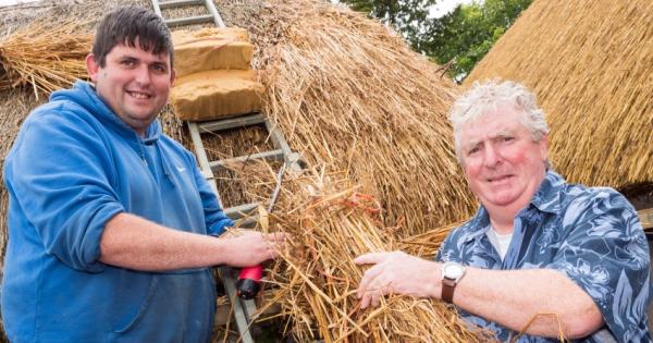 Longford based Thatcher, Ken Leonard, originally from Broadford, and Paul Darby of Yew Cottage, Mountrice, Monasterevin, pictured at the Thatching Demonstration at the cottage, a Heritage Week Event. Photo Tony Keane.