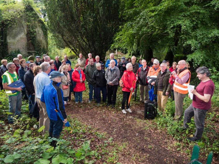 Raphael Ryan and local historian Paul Cooke (right of picture) address the Newbridge Local history Group’s visit to Great Connell Graveyard, Baroda, Newbridge, a Heritage Week 2017 event, Tuesday, August 22.