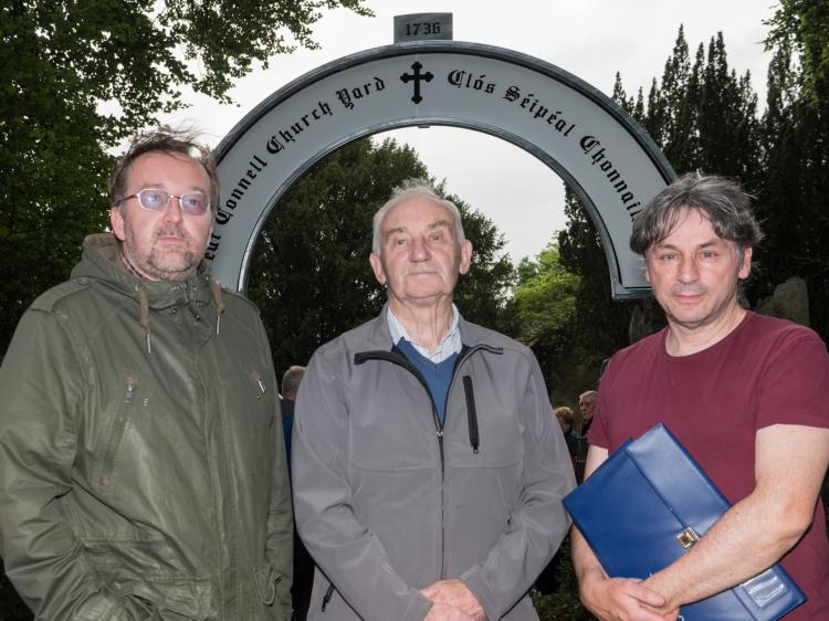 Martin Murphy and Oliver Murphy who made the new name plate at Great Connell Graveyard, with Local Historian Paul Cooke who conducted the talk organised by Newbridge Local history Group’s visit to Great Connell Graveyard, Baroda