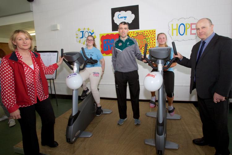 The Pedal4Hope fundraiser involved students and staff cycling stationary bikes in the canteen area for a prolonged period to raise money for Pieta House and St. Patrick's Mental Health Services.