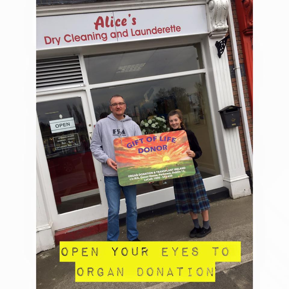 Student Niamh Hanafey promoting organ donation to Alan Darcy of Alice's Dry Cleaning in Rathangan