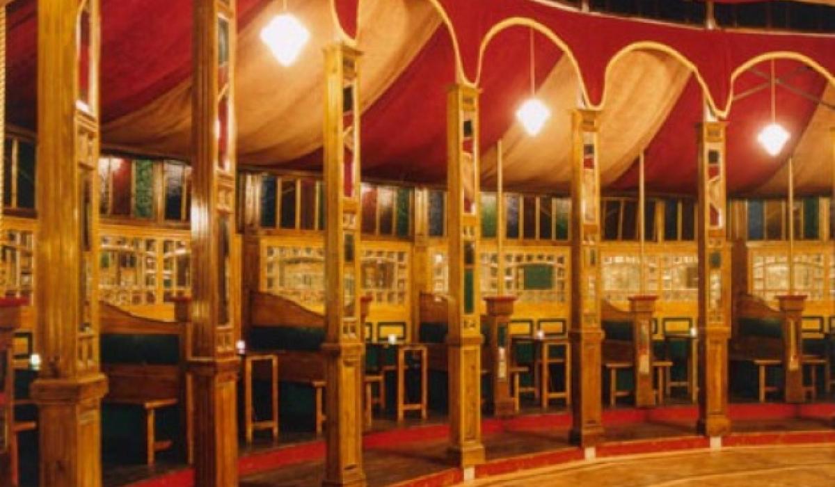 A spiegeltent (Dutch for “Mirror Tent”) is a large travelling tent made with wood and canvas and decorated with mirrors and stained glass.
