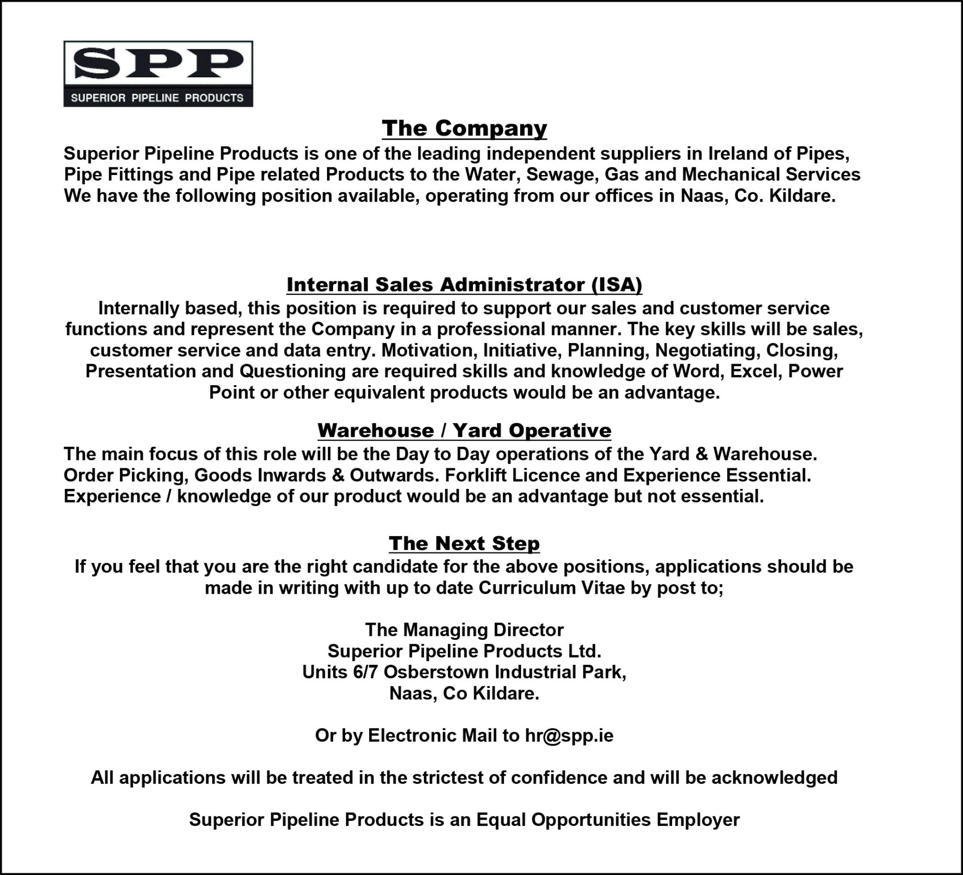 A Naas-based company is hiring an internal sales administrator and a warehouse yard operative.