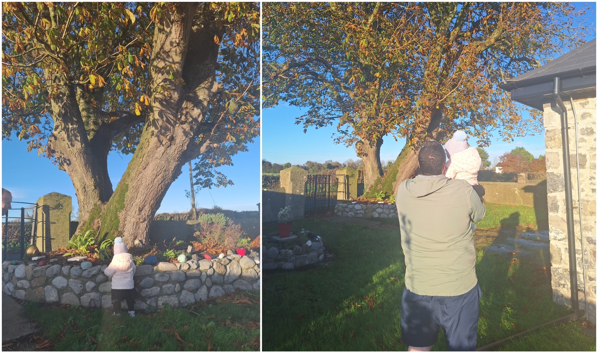 I visited it again with my wife Dearbhla and one-year-old daughter Éabha last week. We gathered up the conkers and I was transported back to my own childhood in fine detail. With each bend down to grab another, it was as if my body and mind were remembering every inch; the good spots low against the back wall where no one else would go digging; the patch of grass outside the boundary. I could hear my grandad’s voice telling us to stay off the road as we’d dart back through the wrought iron gate. I took some pictures with Dearbhla and Éabha and I reminisced as we got back into the car to drive home. In my younger days, we’d make back down the road towards Granny Kelly’s with our haul.