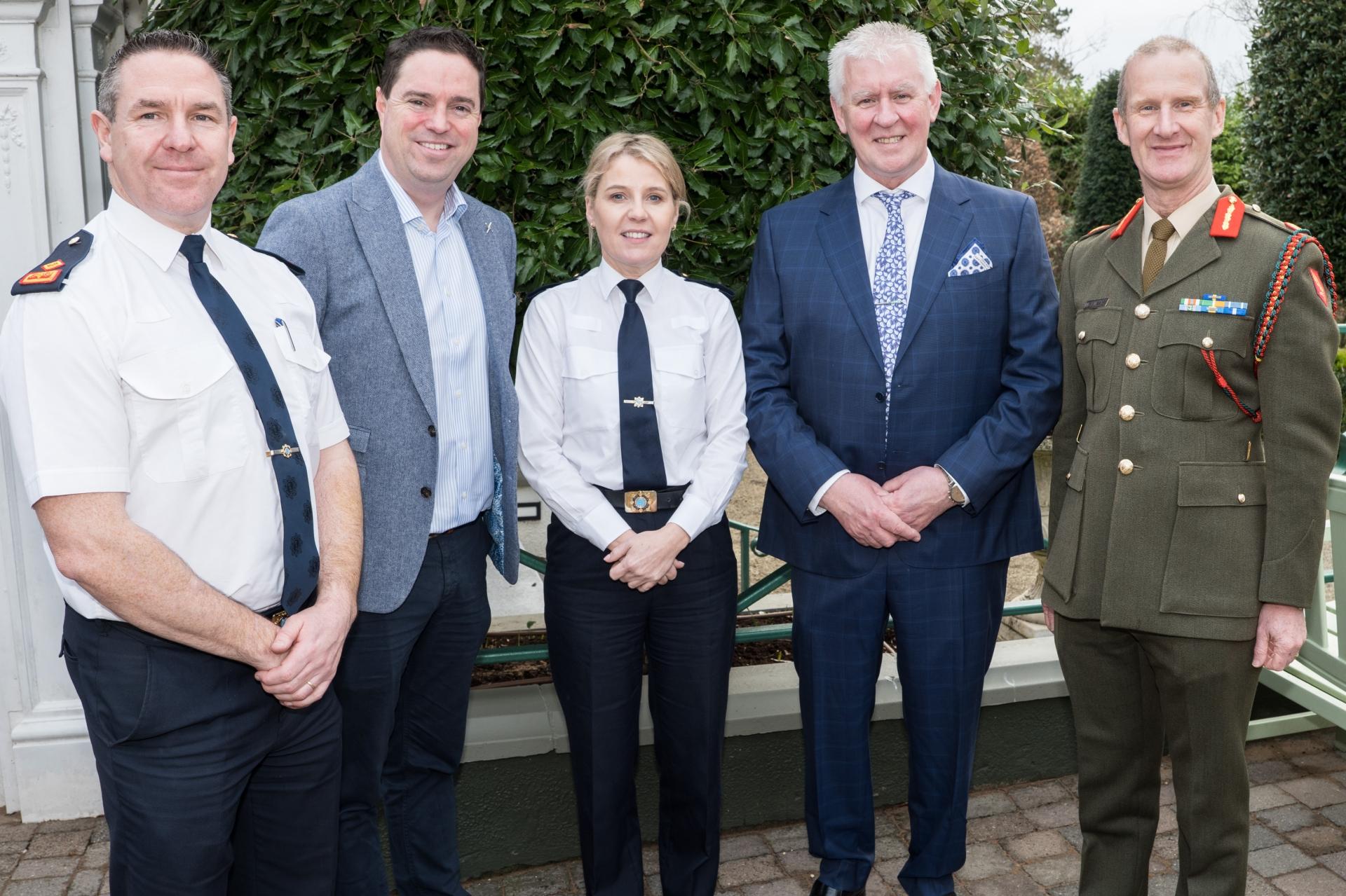 Gda. Supt. Oliver Henry, Naas; Martin Heydon TD; Gda. Supt. Georgina Gray, Leixlip; Gda. Supt. Martin Walker; and Brig. Gen Curragh Command Brendan McGuinness; at a retirement function for Martin in the Keadeen hotel.