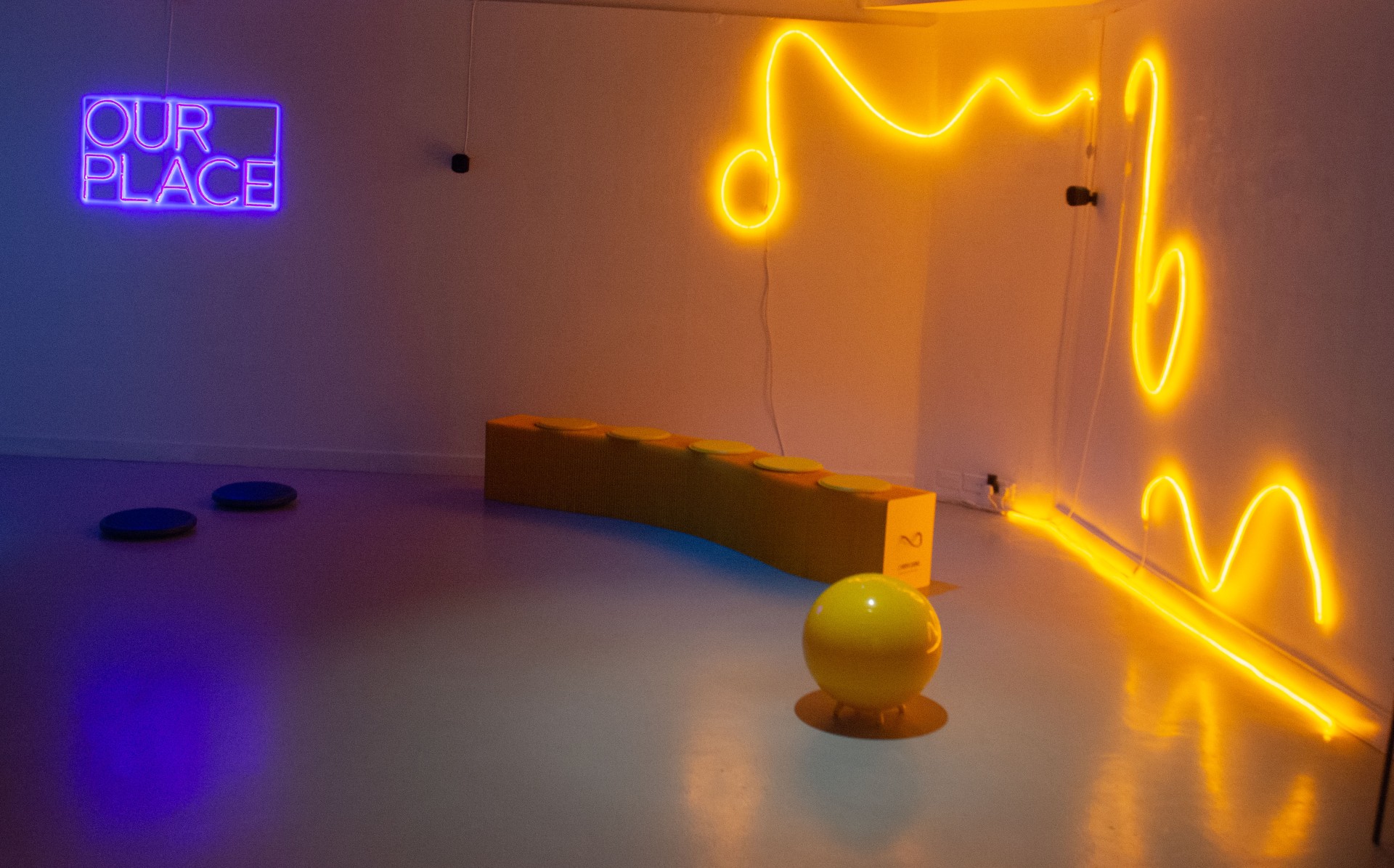 Our Place playfully explores themes of happiness, human rights, and a sense of belonging by transforming the McKenna Gallery at Riverbank Arts Centre into a friendly multi-sensory environment through an electric combination of sound art, storytelling, tactile lighting and comfy seating for everyone to enjoy. A soundscape plays through a system of 12 audio speakers in the gallery with adjustable volume. To further enhance this experience for everyone, three distinct sensory areas within the gallery space have been created including; a social seating area, a time out area, and a tactile string lighting and sculptural area. Lámh, braille and captioned descriptions of sound works are also available to visitors.