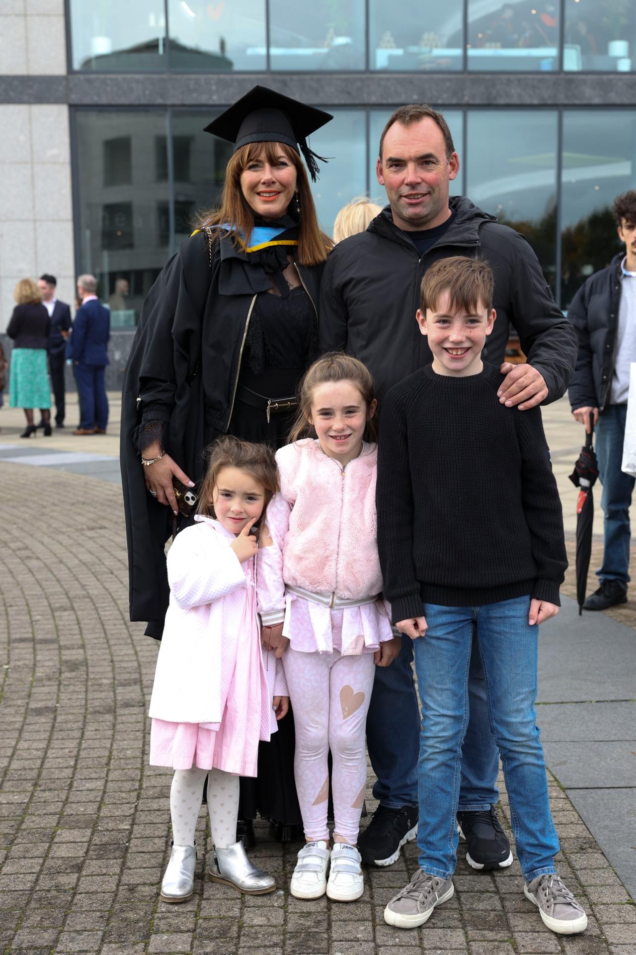 Grainne Duffy from Naas, Kildare who received a MA in Guidance Counselling during the first day of the October graduation ceremonies in DCU. Pictured with her husband Aaron Mac Hale and children Senan (9), Iseult (7) and Elodie (3)