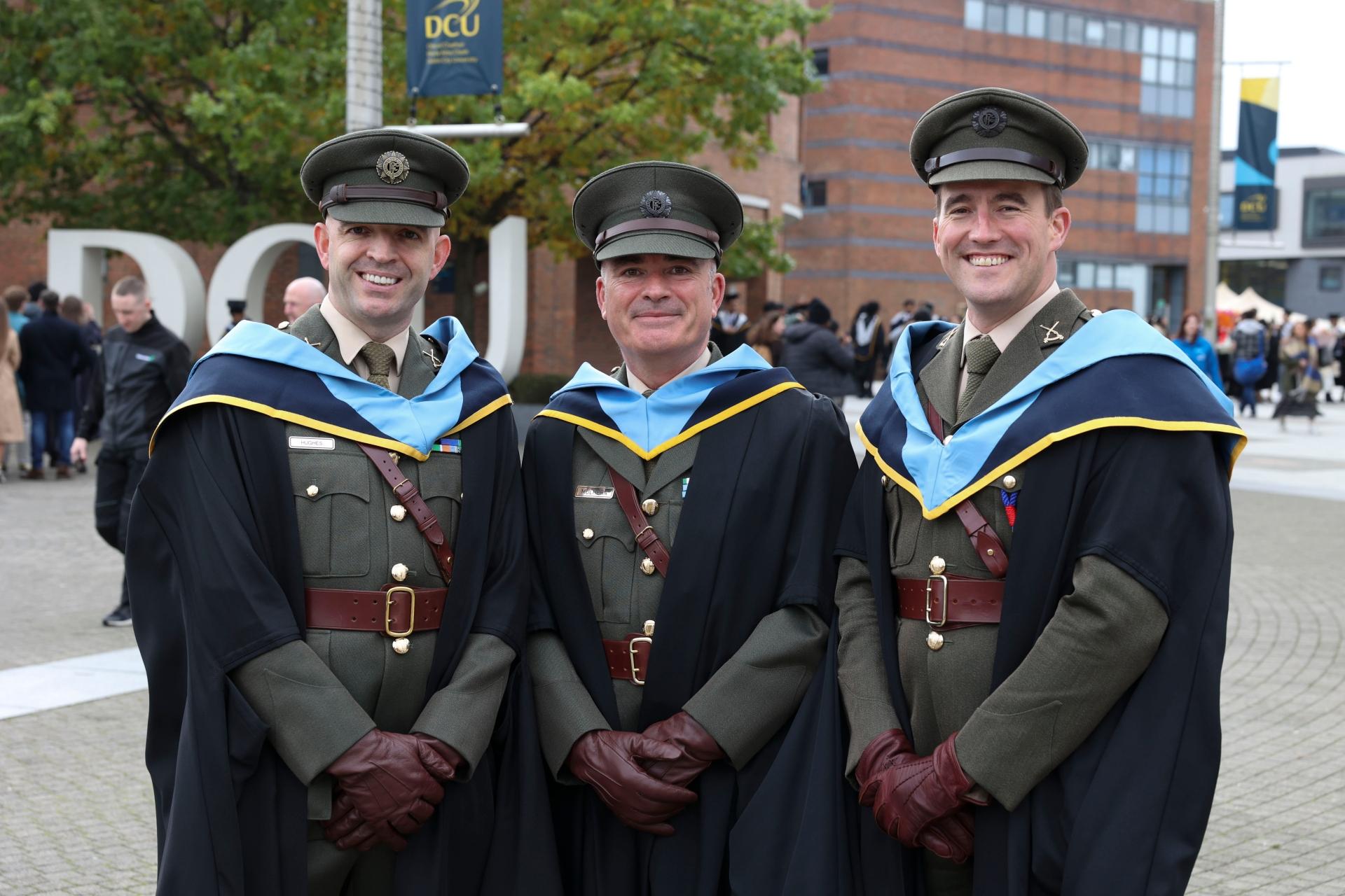 Capt Jonathan Hughes, 12 Batt Limerick, Sgt Major Paul Mulhern, Infantry School, Curragh Camp, Kildare and Cmmdt Rory O’Reilly, Defence Forces HQ who received a MA in Guidance Counselling during the first day of the October graduation ceremonies in DCU.