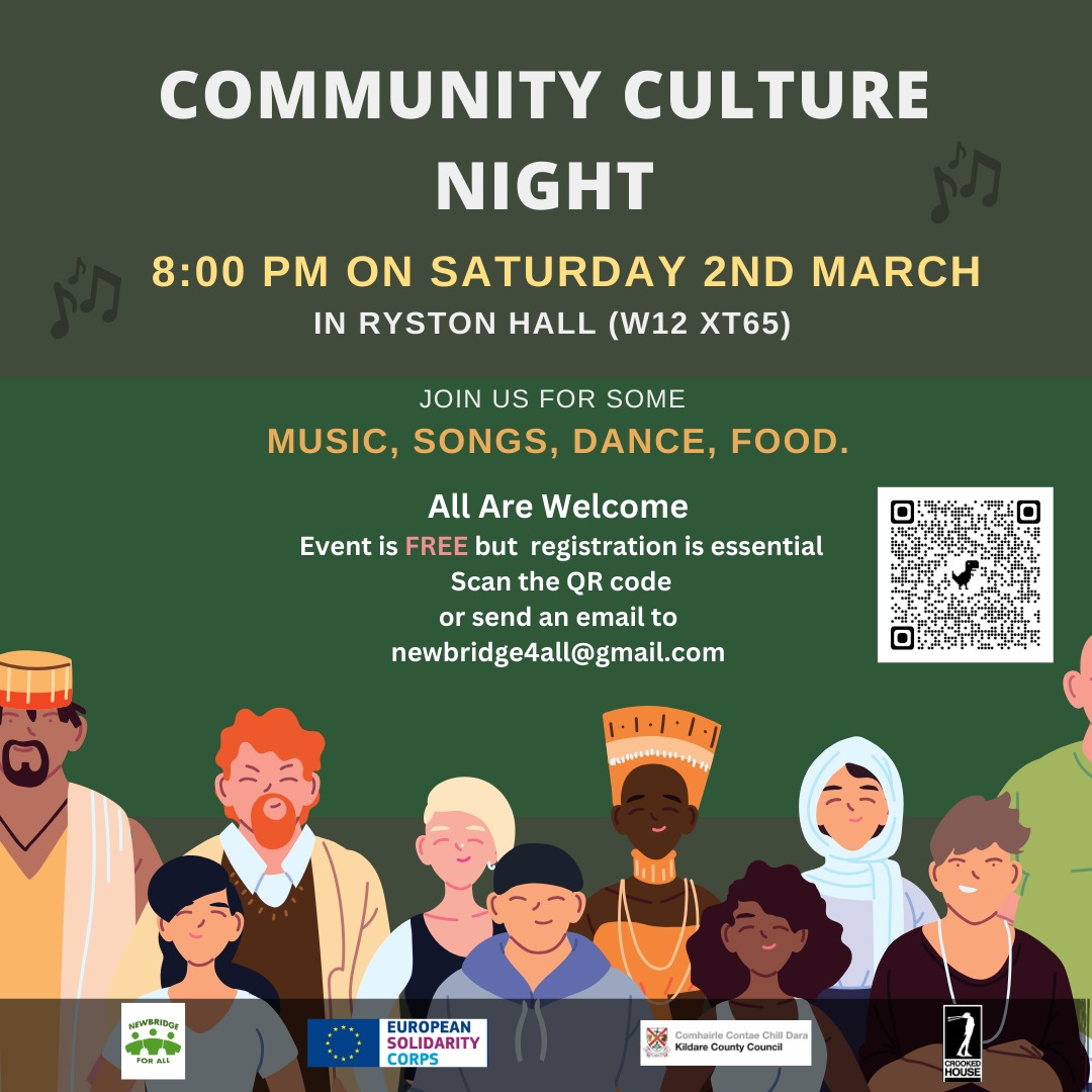 Newbridge for All (An Droichead Nua ag Cách) in partnership with Crooked House is having a Community Culture Night on Saturday March 2 at 8pm in Ryston Hall.