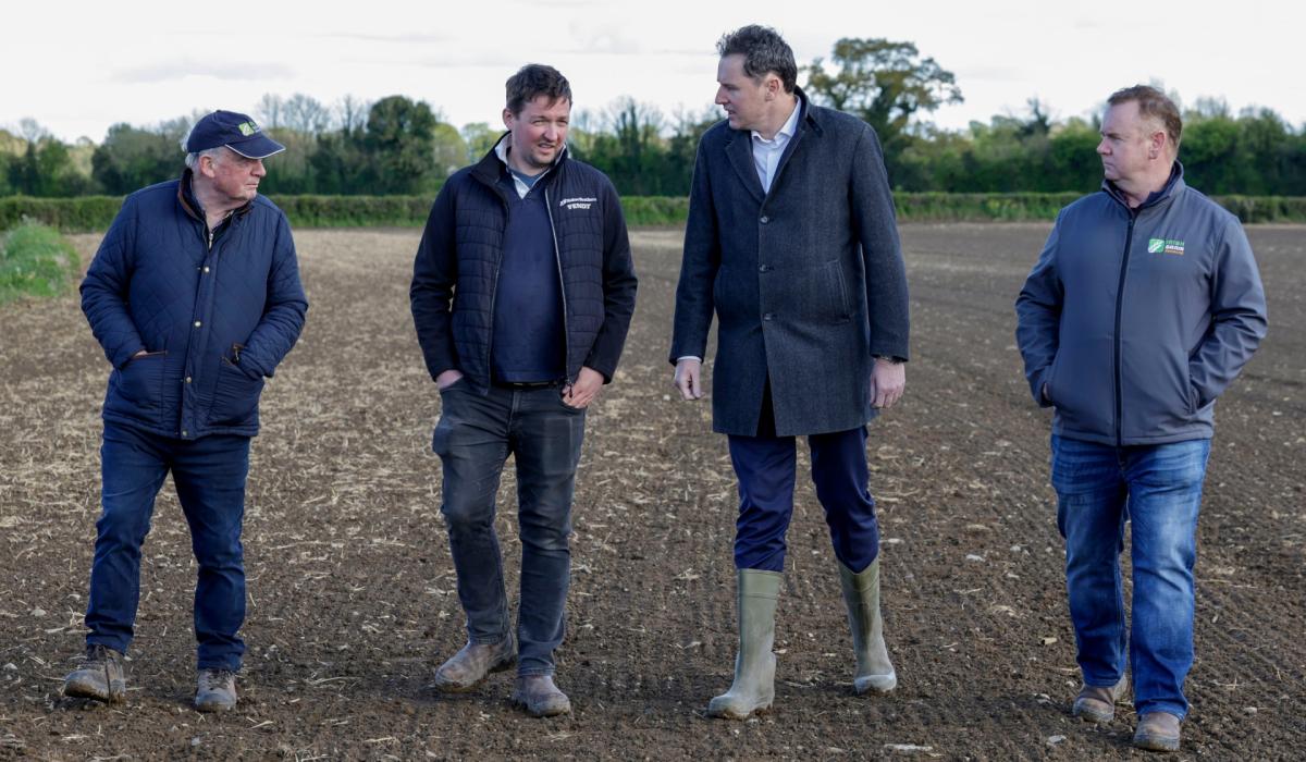 Minister for Agriculture, Charlie McConalogue, TD, with (L-R) landowners Pat Cleary and Darragh Cleary and Bobby Miller, chairman of Irish Grain Growers in Ballybrittas. Pic: Maxwells