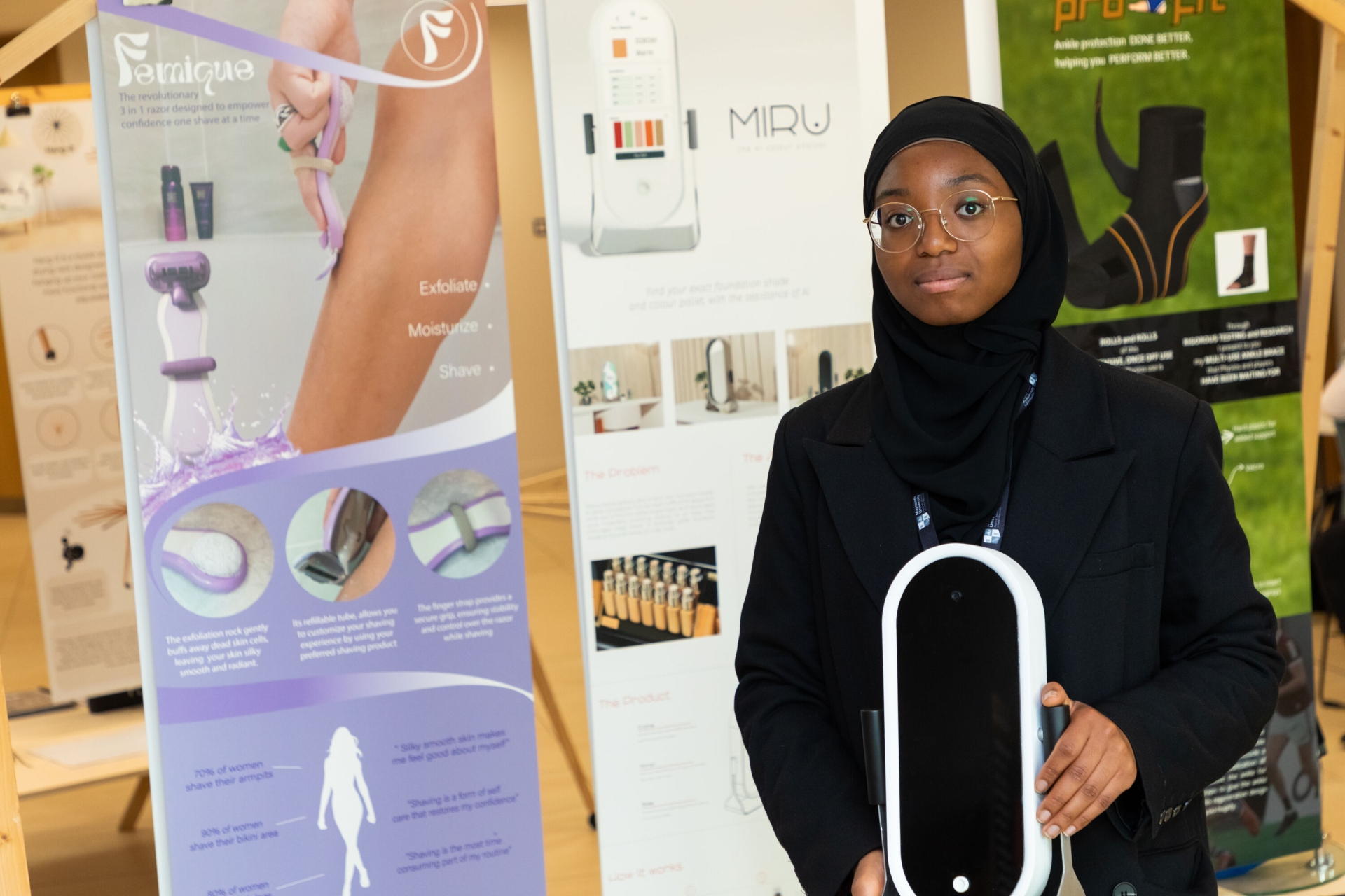 Final-year student Fatimah Wan pictured with her Miru project at Maynooth University’s 2024 Design Degree Show. Photograph supplied by MKC Communications.