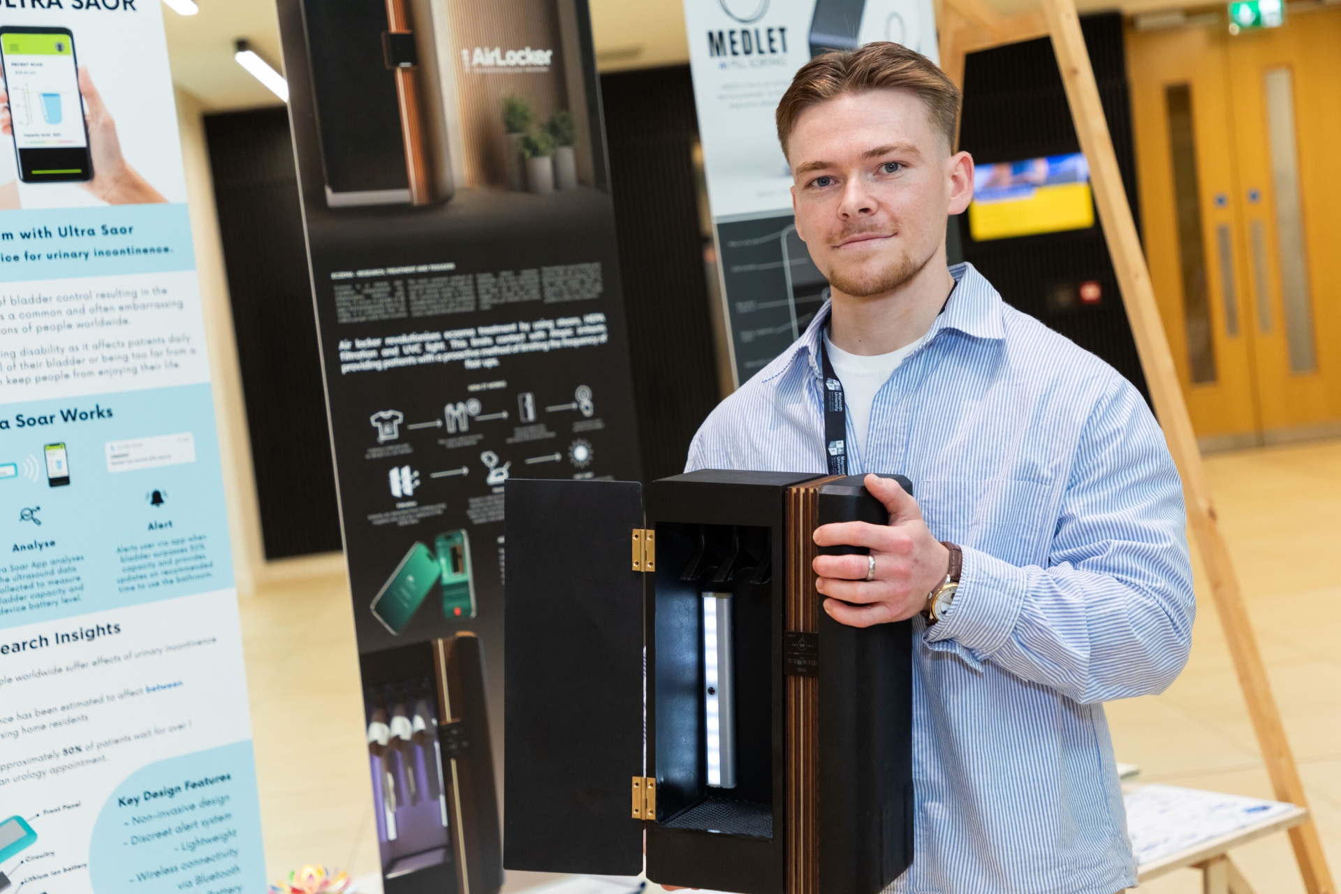 Final-year student Eoin Conlon pictured with his Air Locker project at Maynooth University’s 2024 Design Degree Show. Photograph supplied by MKC Communications.