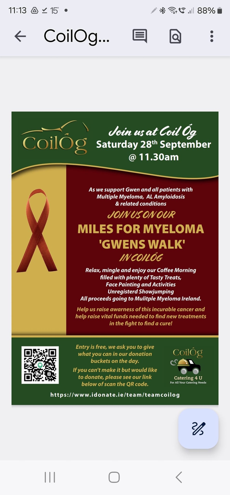 The Miles for Myeloma "Gwen's Walk" is taking place in Coilóg Equestrian Centre at 11.30am on this Saturday.