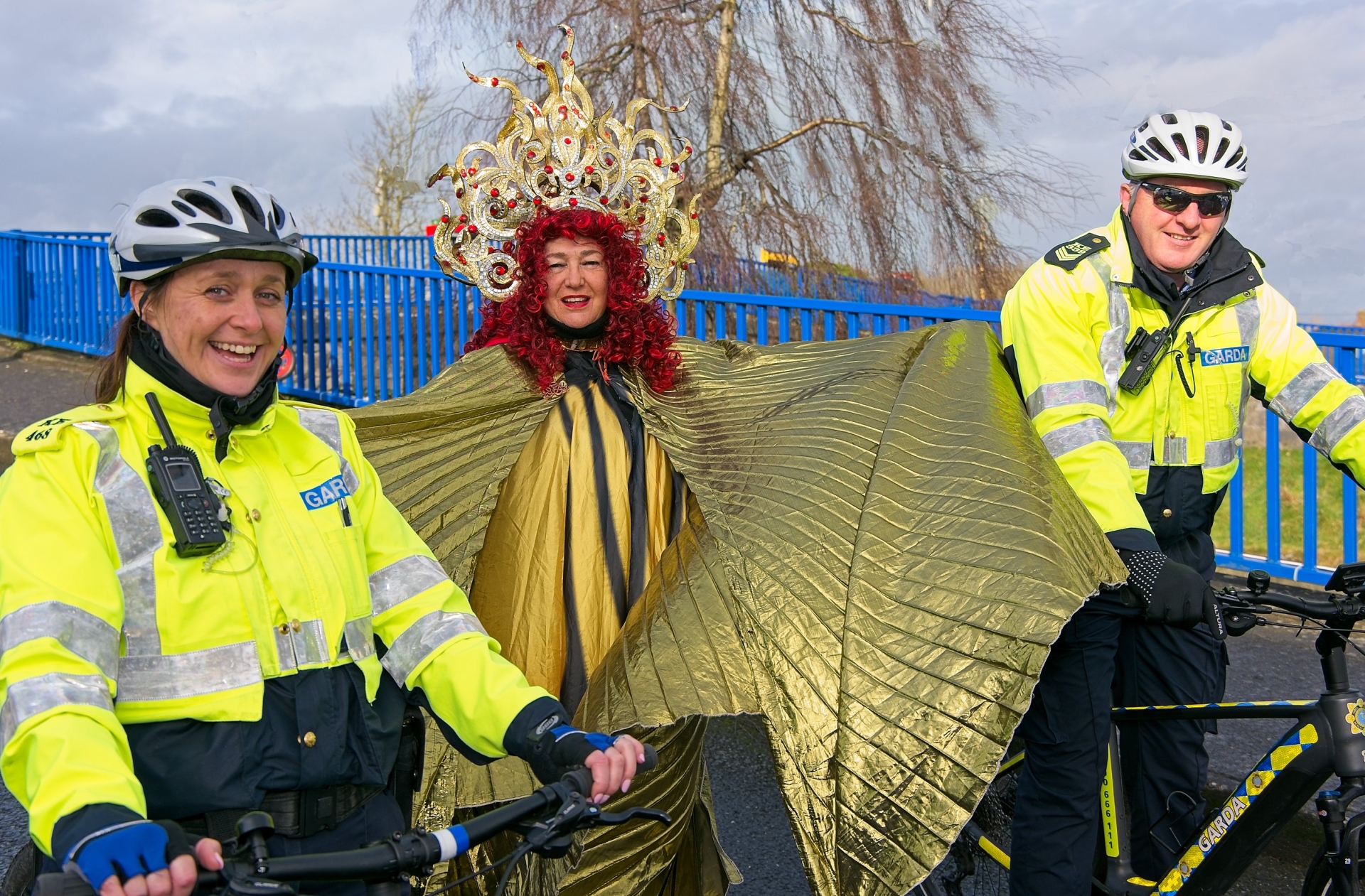 Cllr. Carmel Kelly as St Brigid with Garda escort, Garda Deridre Davoren and Garda Seamus Muldowney