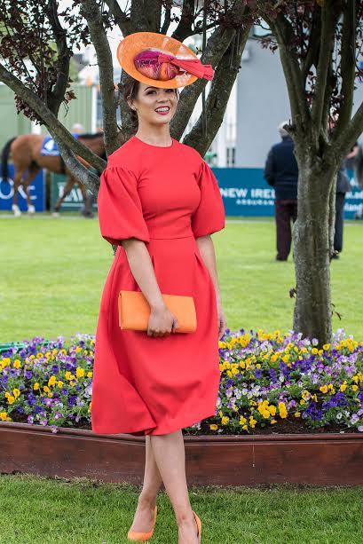 Sarah McEvoy wore a stunning red number from the Savida range in Dunnes Stores, a headpiece by Aimee Farrell Designs and her orange shoes and bag were from Dorothy Perkins.