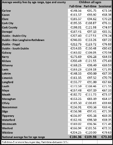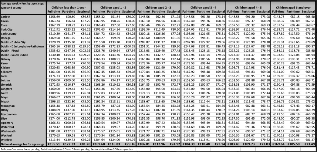 The lowest full-time fees, for children 2-3 years old, were recorded in Co. Carlow at €148 per week, with the highest full-time fees recorded in Dublin (Dun Laoghaire Rathdown), at €251 per week for children.