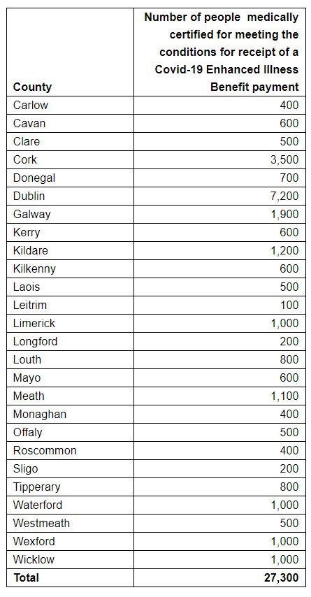 Additionally, in Co Kildare, there are also 1,200 people who are medically certified for meeting the conditions for receipt of a Covid-19 Enhanced Illness Benefit payment.