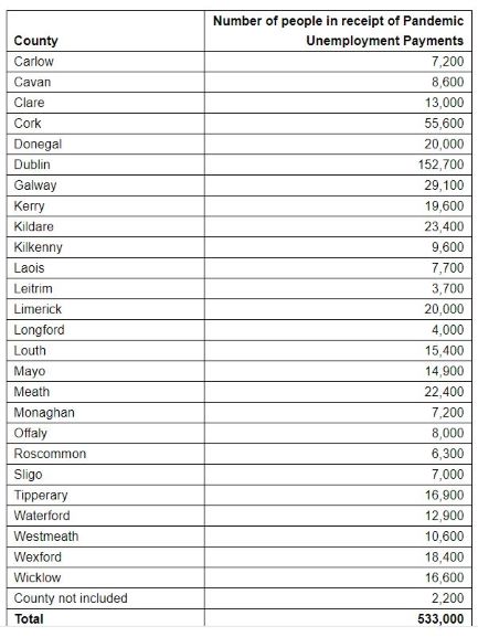 Today, the Department of Employment Affairs and Social Protection issued payments to 23,400 people living in Co Kildare in respect of their Covid-19 Pandemic Unemployment Payment.
