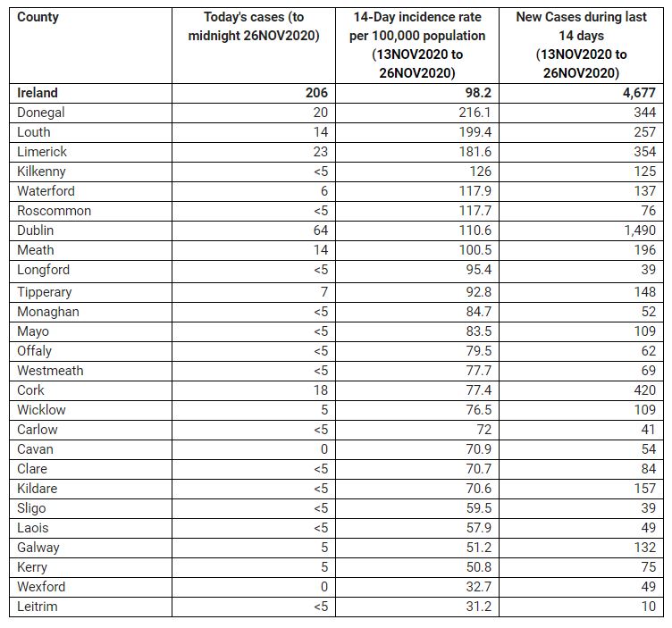 As of midnight Thursday 26th November, the HPSC has been notified of 206 confirmed cases of COVID-19. There is now a total of 71,699* confirmed cases of COVID-19 in Ireland.
