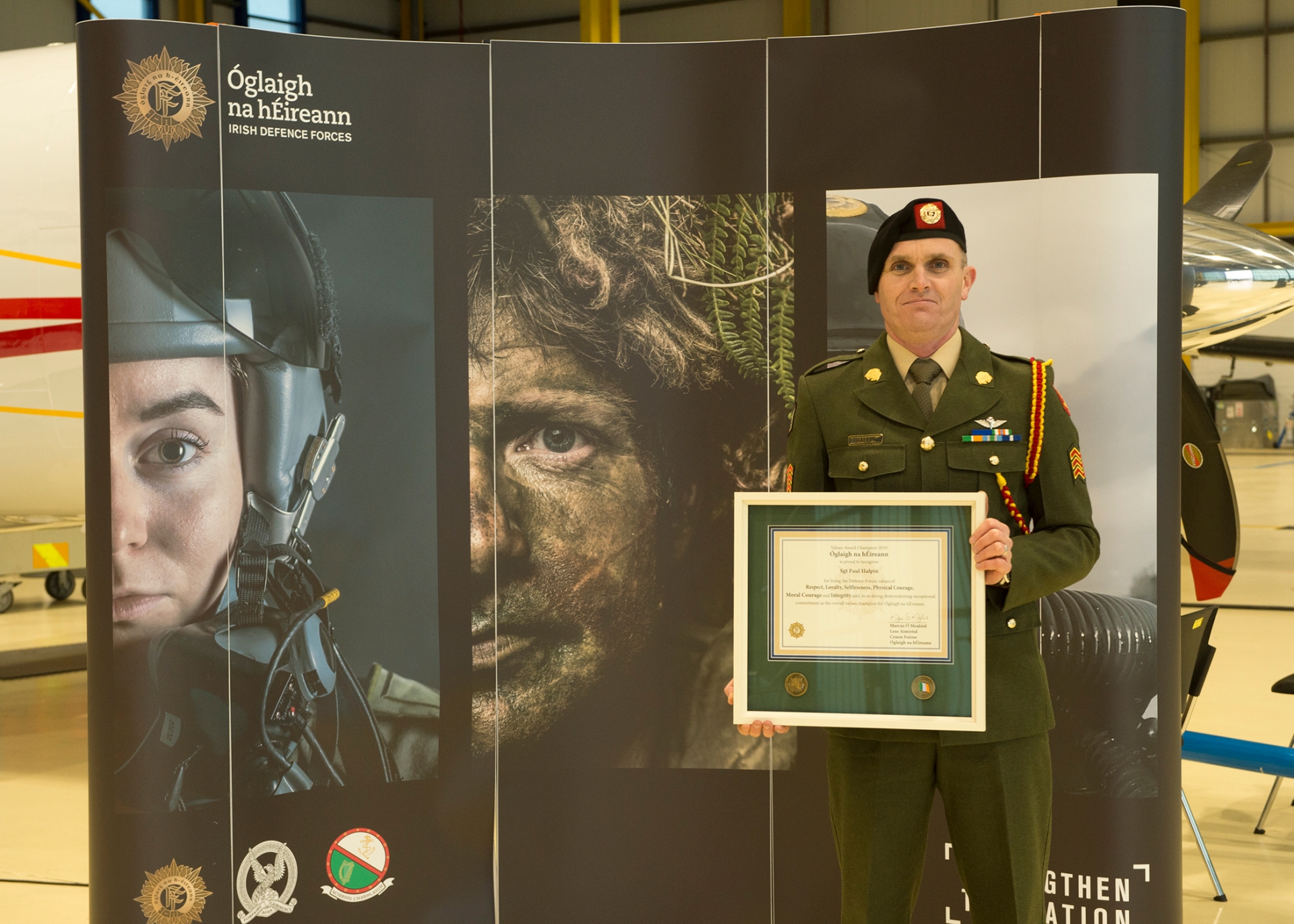 Sgt Paul Halpin based in the National Stores Reception Centre, DFTC, received the overall Values Champion Award and his citation reads “For enactment of the Defence Forces values of Respect, Loyalty, Selflessness, Physical Courage, Moral Courage and Integrity and, in so doing, demonstrating commitment to the mission and vision of Óglaigh na hÉireann”.