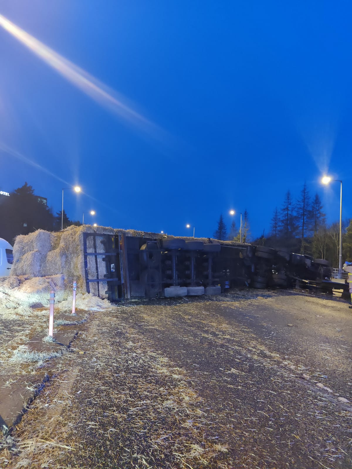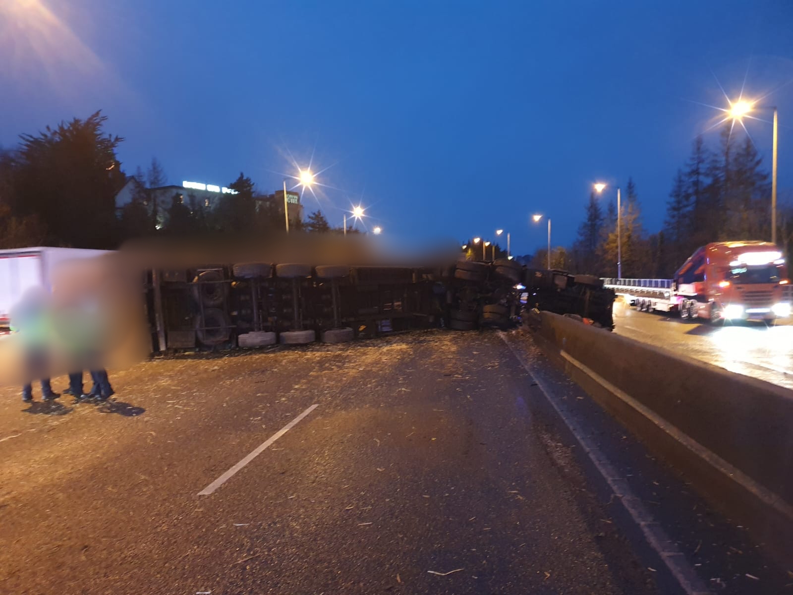 Gardaí and Emergency services with heavy lifting equipment are currently at the scene of an overturned lorry which was transporting hay bales on the N4 Westbound at the Dodsboro exit near Lucan.