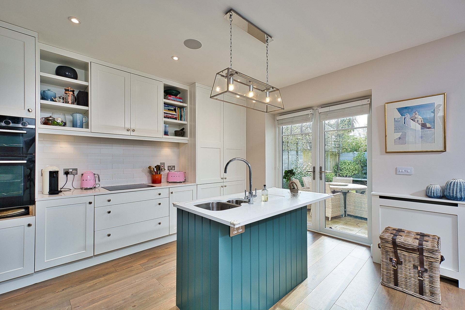 Upon entering, you are presented with an excellent standard of finish with features such as wood panel wall finish throughout, a solid herringbone floor, radiator covers and bespoke integrated television stands. The property also boasts a south-west facing garden with mature planting, paved patio area with wall fence surround.