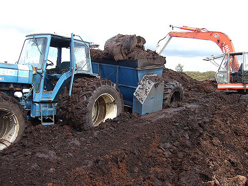 If the inevitable happens and the wheels are dug in, gouging the bog muck out from around them doesn’t really work. Planks are placed in front of the offending wheels in a bid to gain traction and extricate the tractor and trailer from this unfortunate situation.