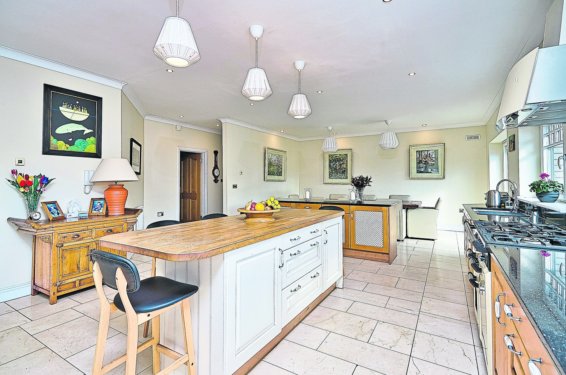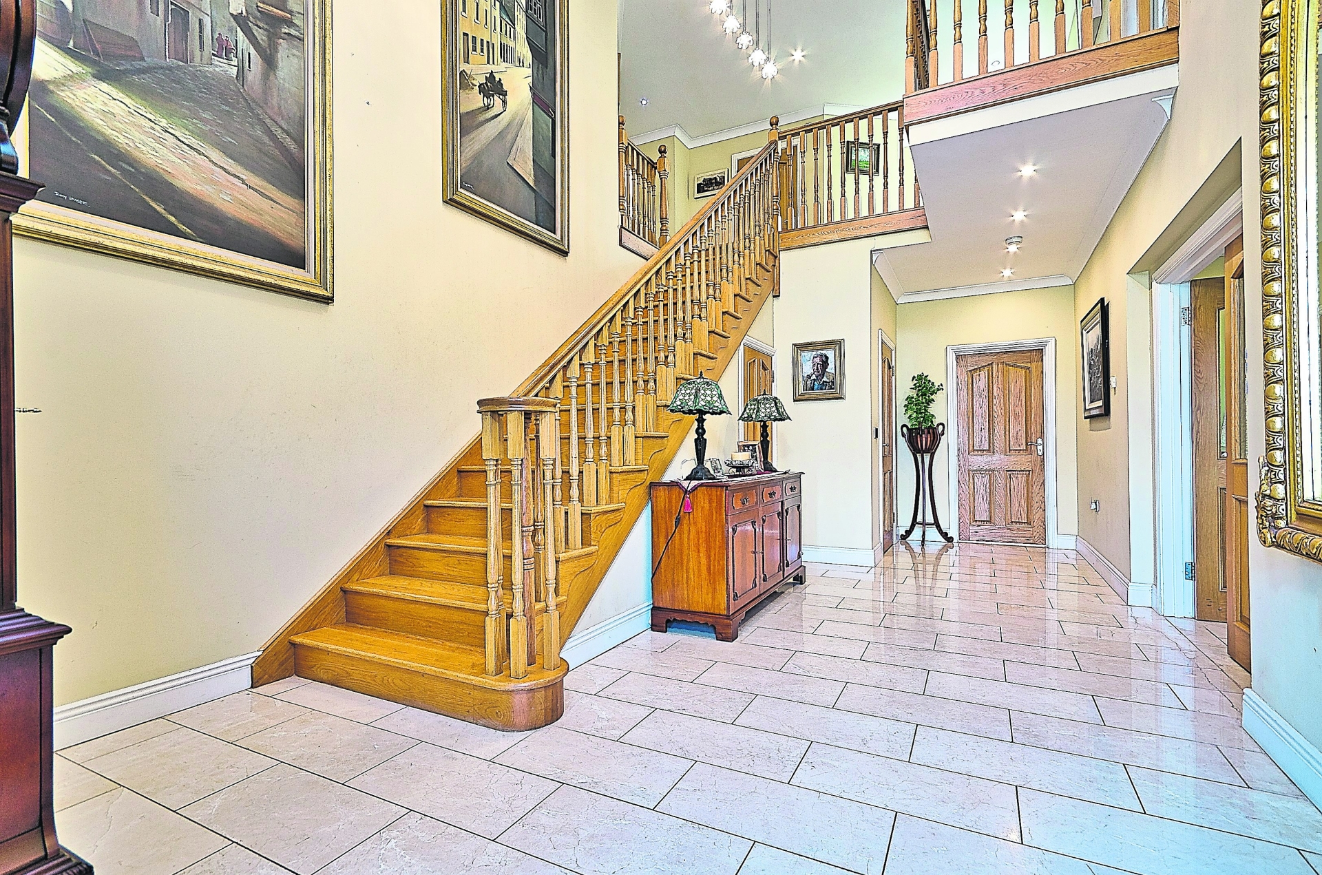 Entering the house through the beautiful double doors you’ll immediately get a sense of this spacious and light filled home. There are five bedrooms, four of which are en-suite with walk in wardrobes, a feature kitchen/lounge/dining area with utility room and larder and many other generously proportioned rooms to boot.