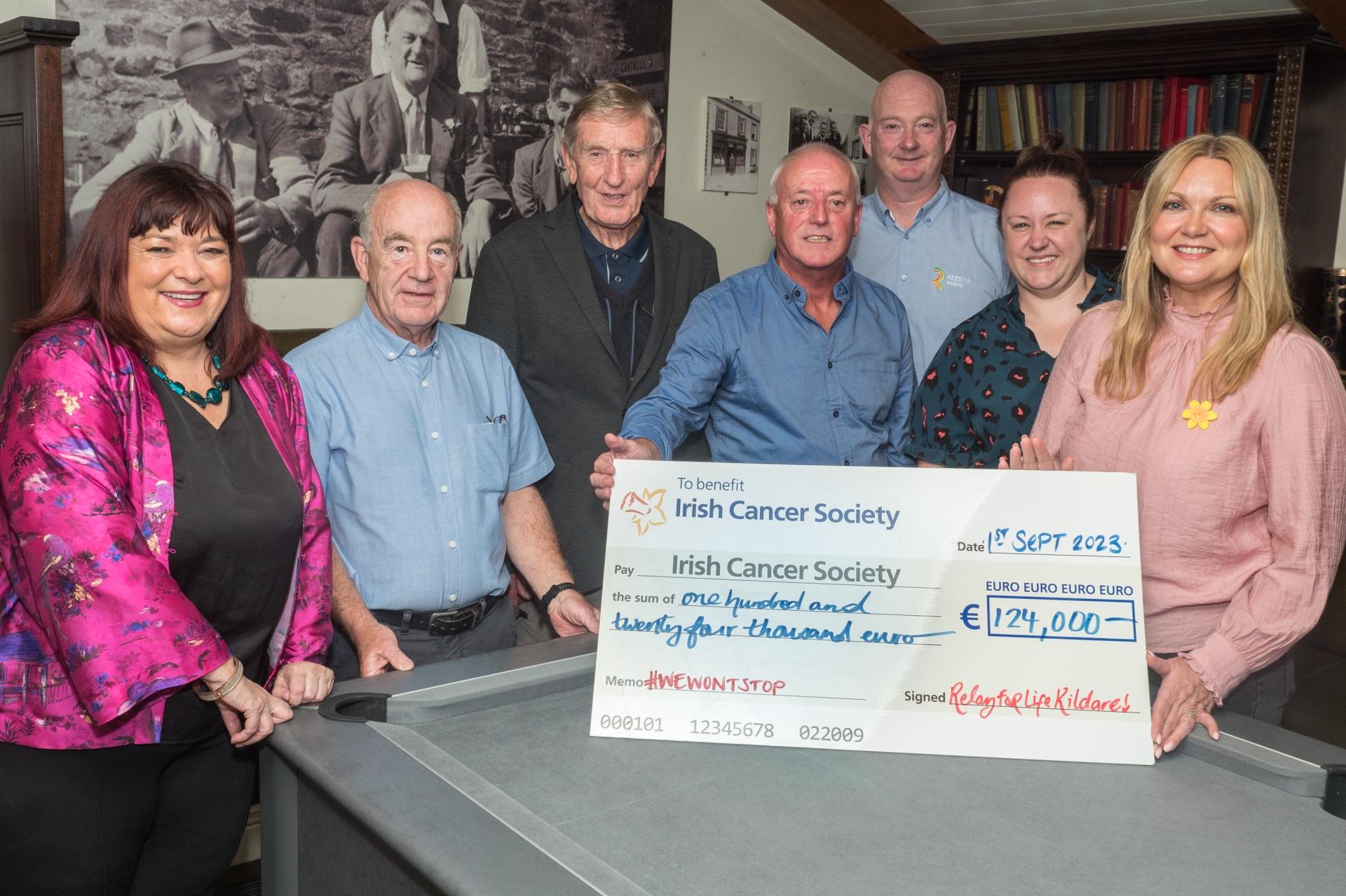 MC for the evening Brenda Donohoe; committee members Stephen Kelly, Peter O’Neill, Chairman Peter Whyte, Michael Fleming, and Lisa Nagle, presenting a cheque for €124,000 to Ciara Hughes, Relay for Ireland Campaign Manager at the Irish Cancer Society, pictured at the Kildare Relay for Life 2023 Cheque Presentation Night in Coffeys Lounge, Newbridge, Friday night, September 1.