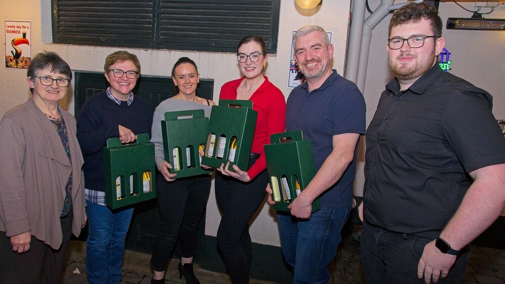 Mary Dunne with the first prize winning team of Brigid Loughlin, Carla, Sarah and Art McGauran, with Luke Gannon, representing sponsors Manzors of Clane.