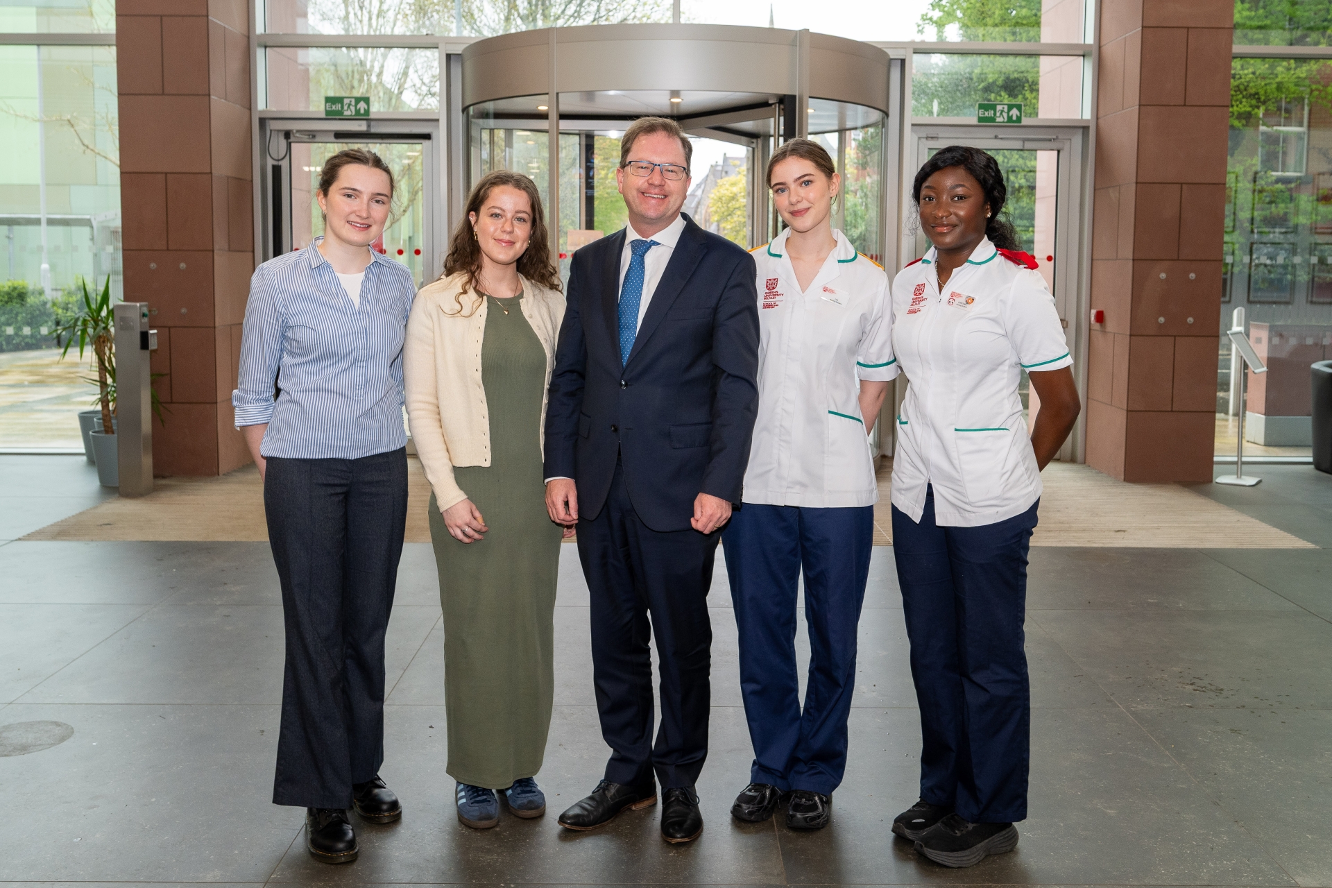 Minister Lawless meets Queen's University Belfast students Ellen McDonald, Riona McFadden, Lily Anderson, Cristabel Bakare. Photo supplied by the Department of Further and Higher Education, Research, Innovation and Science
