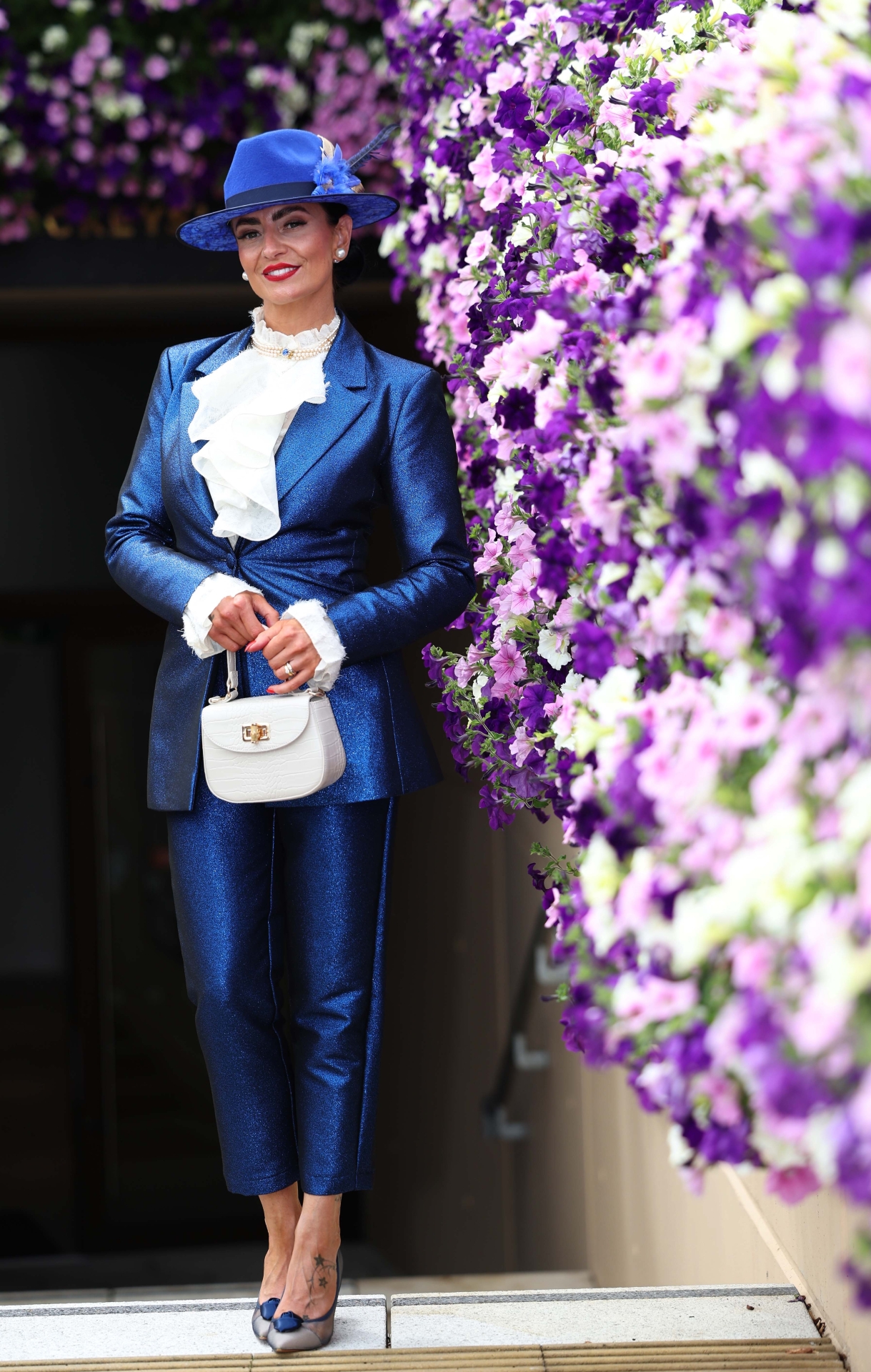 She accompanied the suit with shoes from Dune, a hat by Alison Roe Roscrea.