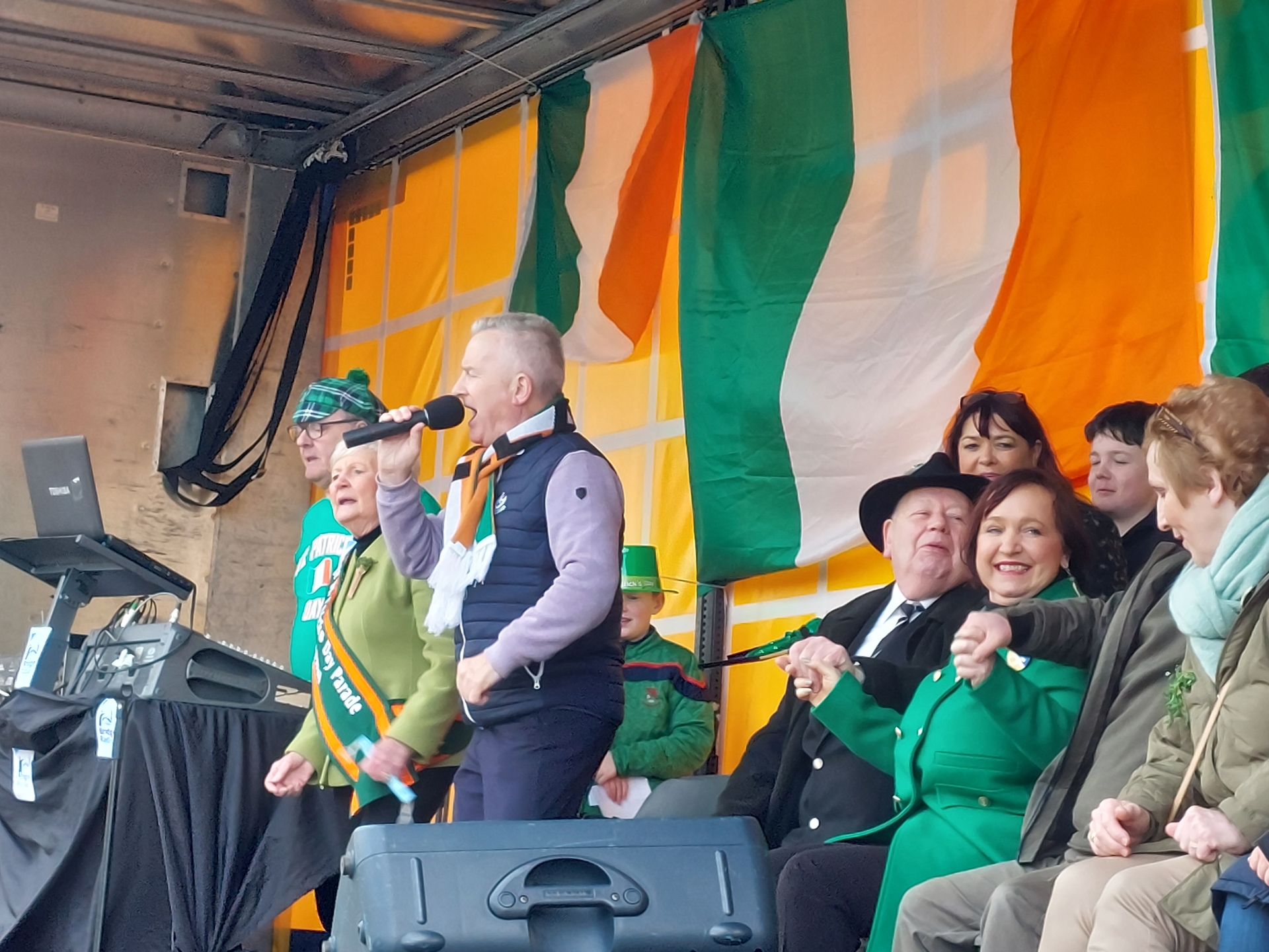 Singer Johnny Peters entertains the crowd on the viewing stand at the Newbridge St Patrick's Day Parade