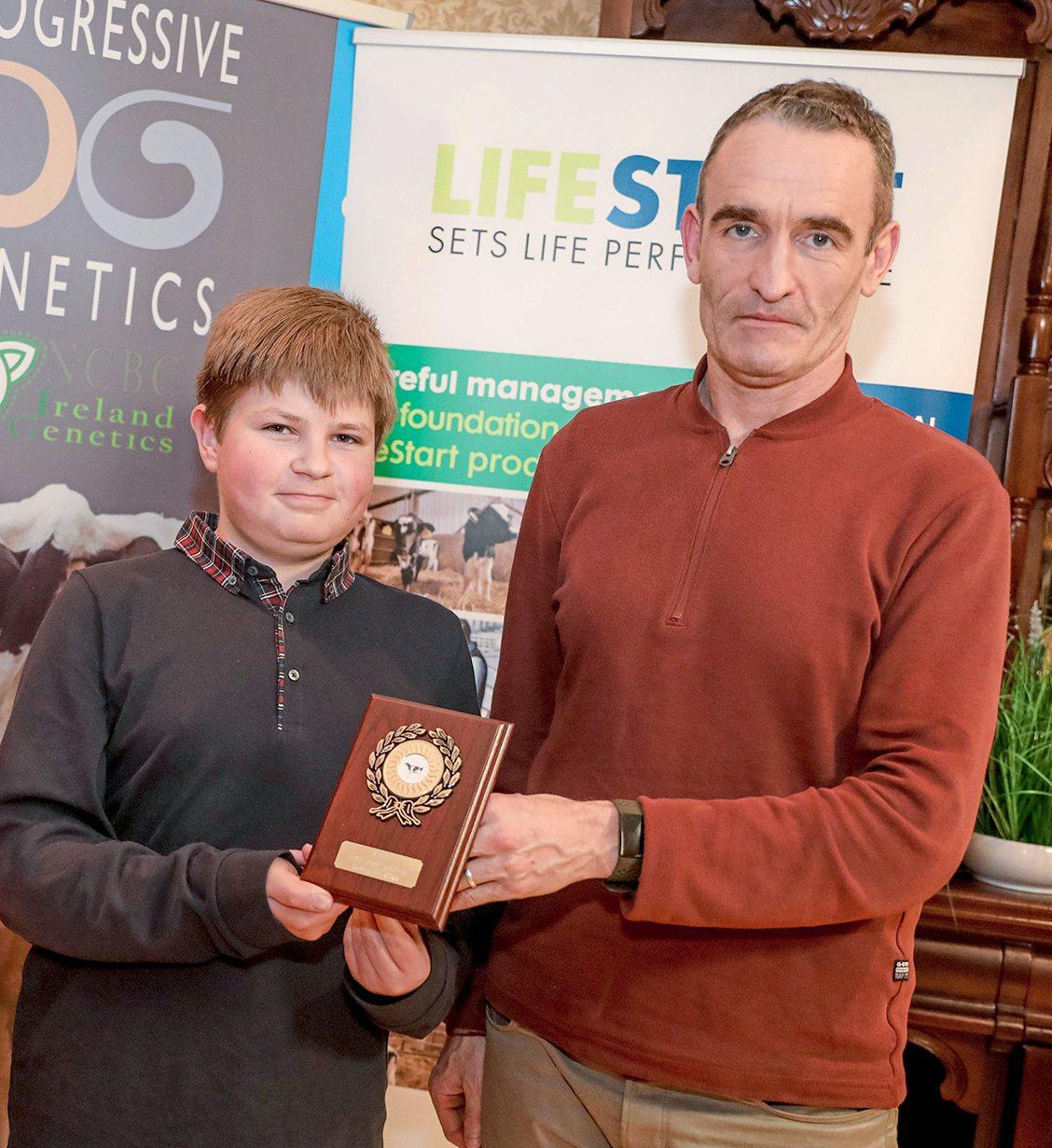 Sponsor Brian Scully (FBD) presents William Stanley with 1st place in the KHFC FBD Stock Judging Junior Award