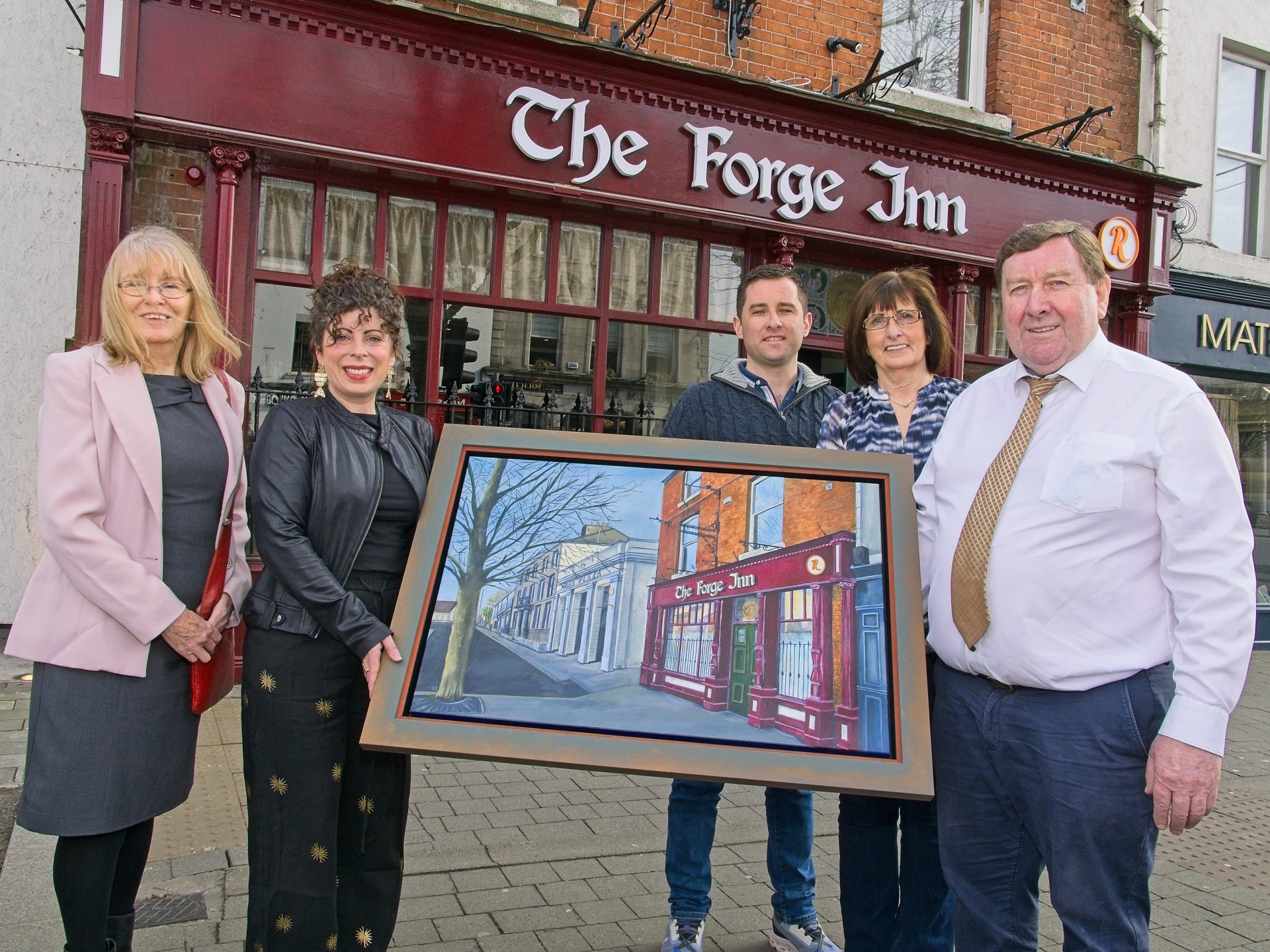 Eithne Delaney, Chairperson, with artist, Sarah Gallagher, of Naas Art Group, presenting a specially commissioned painting to the proprietors of the Forge Inn, Naas, members of the Roche family, Eoin, Anette and Ger.