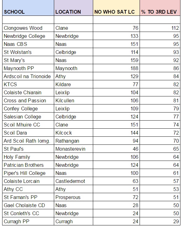 Below is the list of secondary schools in Kildare and the percentage of the students who went to third level education after their Leaving Certificate. It also shows how many students sat their Leaving Certificate this yea.