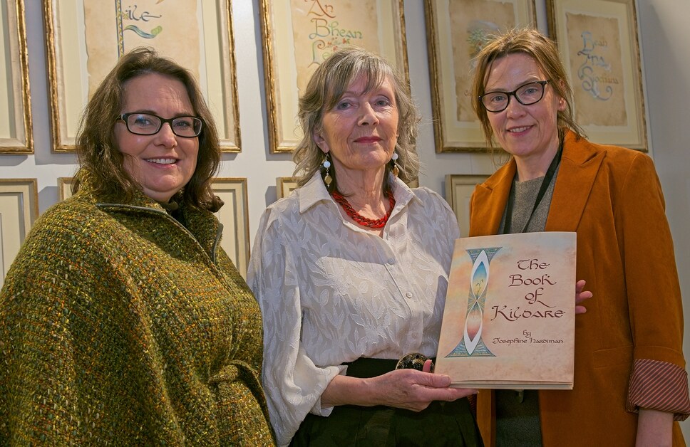 Pictured: Muireann Ní Bheafgaoich, Oifigeach Gaeilge KCC; Artist/Calligrapher Josephine Hardiman, and Andrea Darmody, Manager, Naas Library and Cultural Centre, at the launch of the inaugural exhibition.