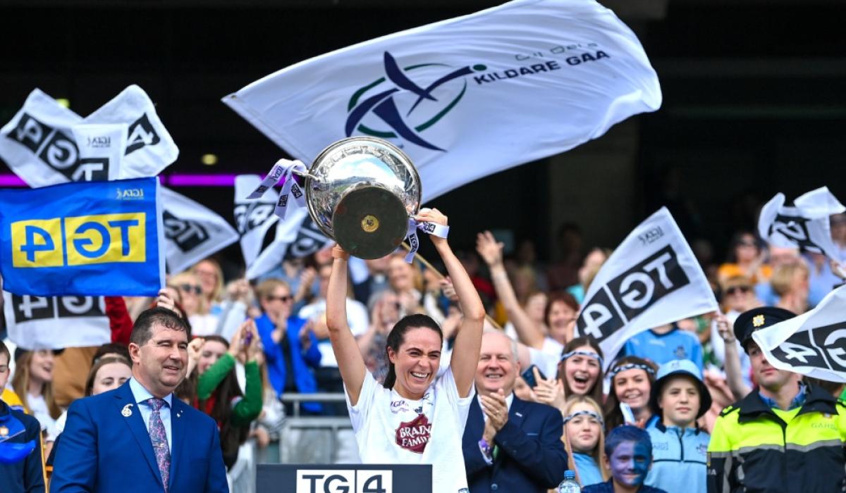 ; Kildare captain Grace Clifford lifts the Mary Quinn Memorial Cup after the 2023 TG4 All-Ireland Ladies Intermediate Football Championship Final, Photo by Seb Daly/Sportsfile