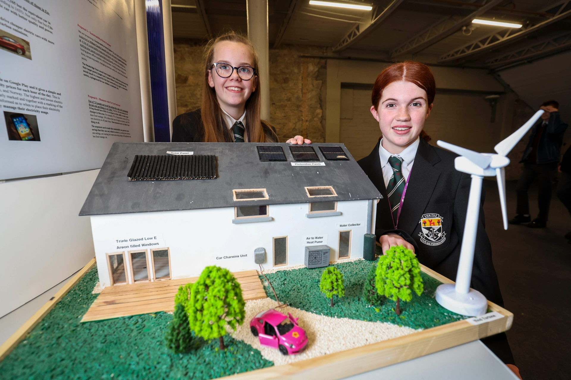 Grace Joyce and Amira Curran from Newbridge College Kildare and their project 'Does the Rising Cost of Living Affect our Ability to Live Sustainably? - A Case Study of a Suburban Town in Co. Kildare' at the BT Young Scientist & Technology Exhibition 2024 in the RDS Dublin.