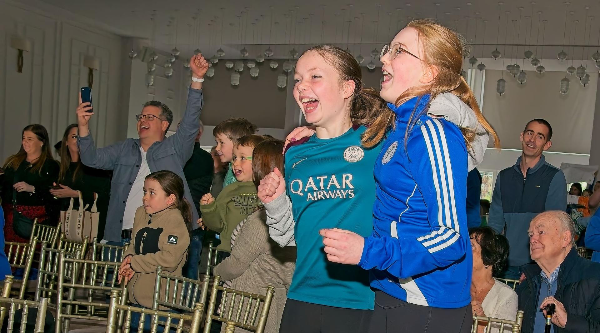 Naas AFC members young and old celebrate the Ireland team victory during their Junior Awards Presentations Day and viewing of the Ireland -v- Hungary game on the big screen at the Osprey Hotel, Naas, on Sunday afternoon, November 16