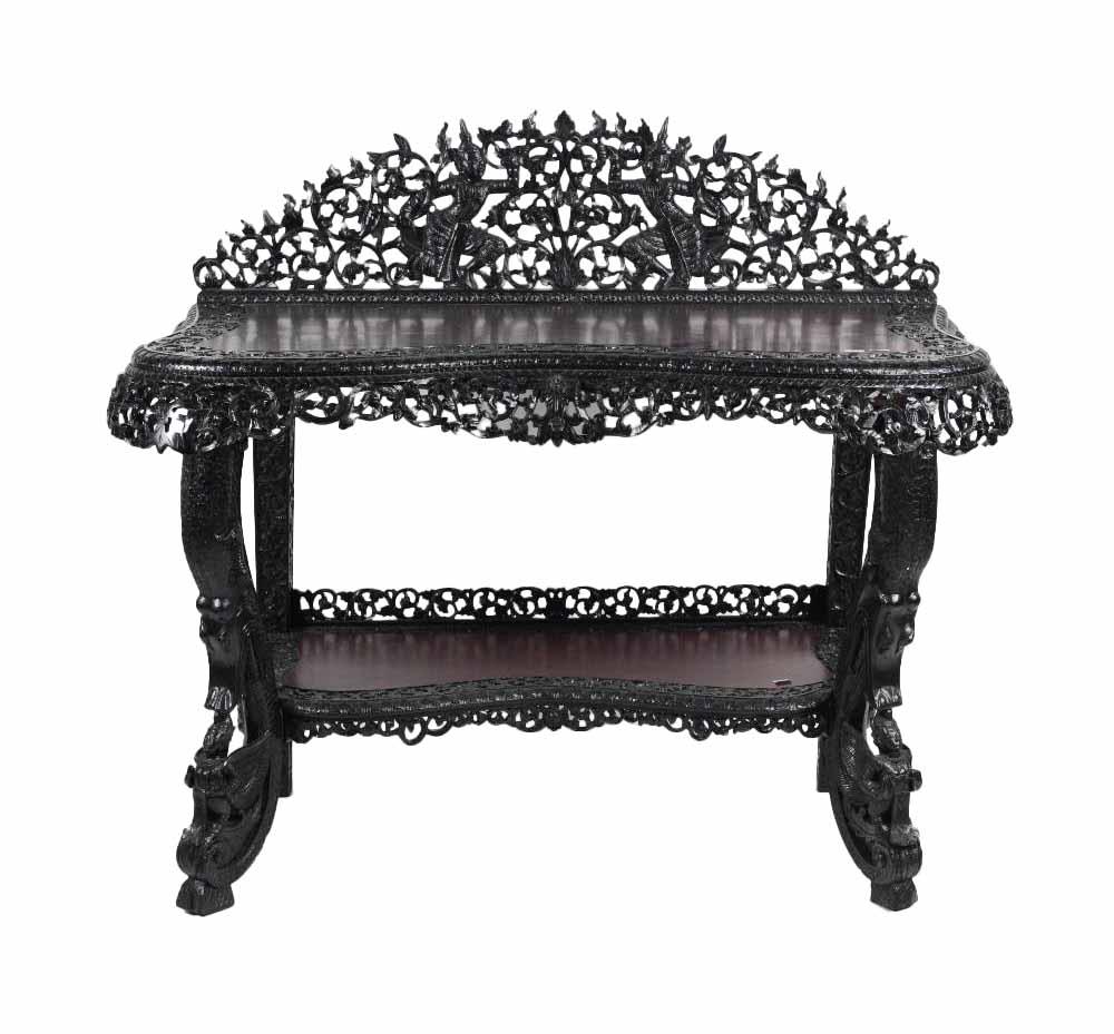 with carved and pierced back, top, shelves and uprights, the back carved with two Indian Dancers, the front legs with winged mythical figures, the entire painted black to assimilate ebony, 114cms high x 131cms wide (45" x 51 1/2"). (1) 300 / 400