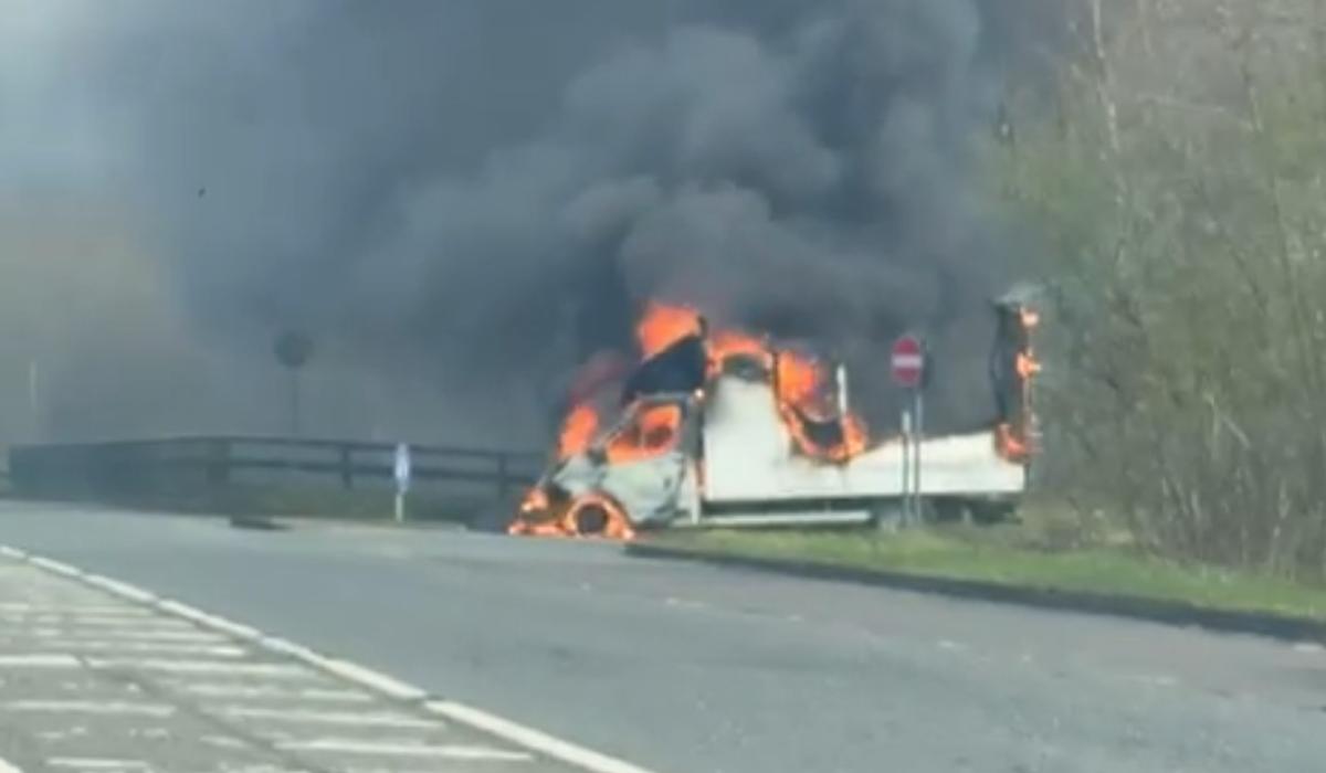BREAKING: Dramatic scenes as Kildare firefighters tackle van fire near motorway