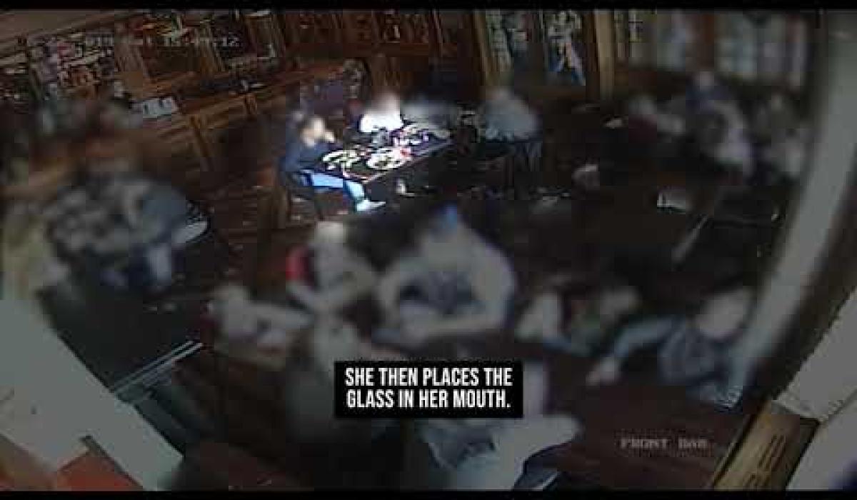 Shocking footage showing a customer taking glass from her top and putting it in her mouth and pretending to choke on it has emerged from a Newbridge pub.