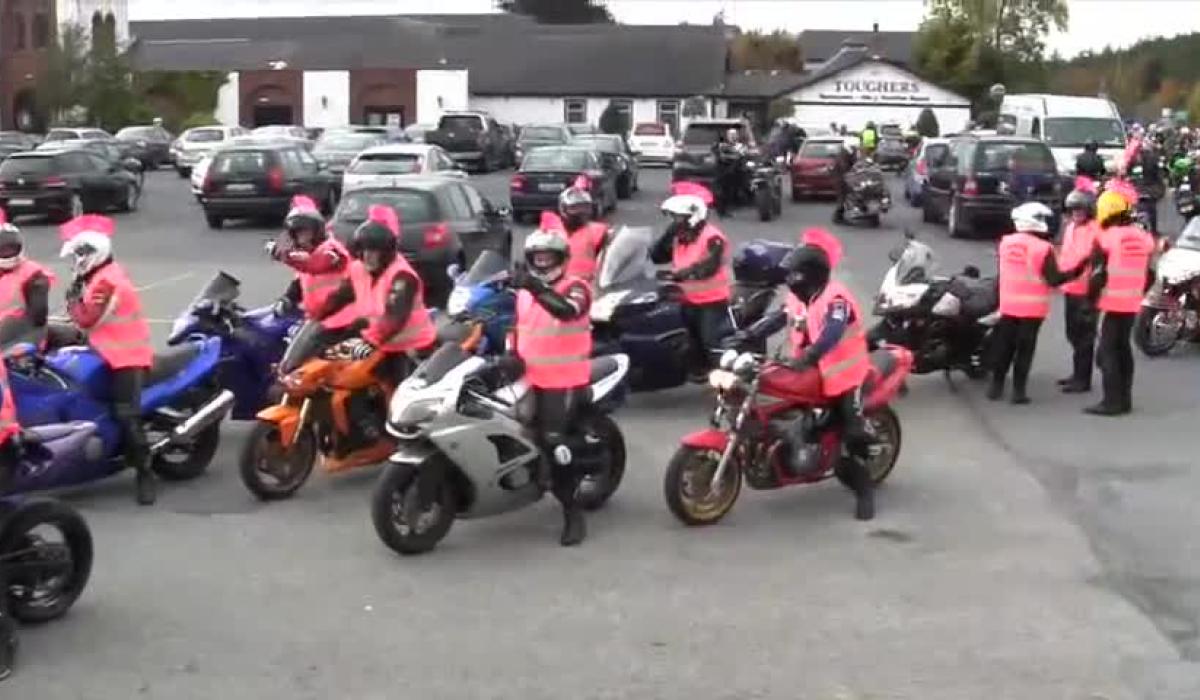 Bikers dressed up in pink vests and stuck pink mohicans on their helmets to raise awareness of breast cancer.